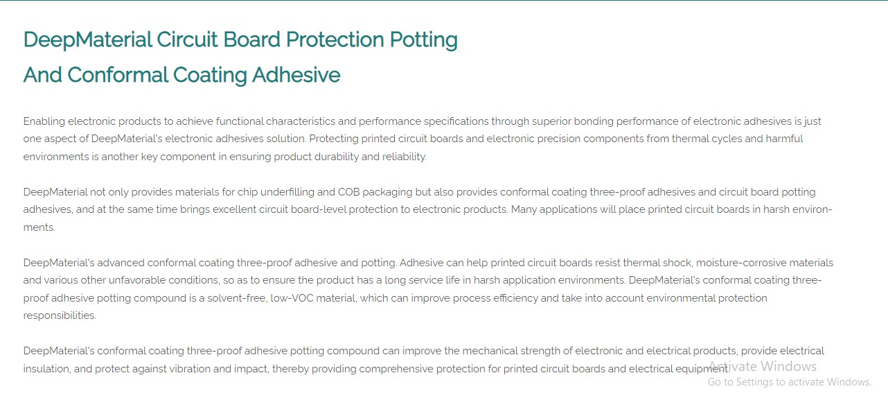 DeepMaterial not only provides materials for chip underfilling and COB packaging but also provides conformal coating three-proof adhesives and circuit board potting adhesives, and at the same time brings excellent circuit board-level protection to electronic products. Many applications will place printed circuit boards in harsh environ- ments. https://www.deepmaterialcn.com/conformal-coating-adhesive.html